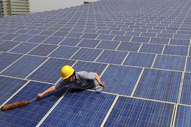 一名工人正在清潔房頂上的太陽能板。天臺太陽能板的鋪設增加了消防救援的難度。