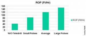 The company has performed a series of well tests on turnkey drillers’ rigs, using both roller cone and PDC bits. In certain lithologies, Teledrill has demonstrated the tool’s ability to triple ROP compared to conventional drilling technology. “While field testing in our first six wells, we never drilled a 30-foot stand in less than 50 feet per hour. We also ran tests where pulsing was activated and then deactivated. Pulsing made a significant difference… On average, the Teledrill ROP was 115 to 120 feet per hour. Without pulsing, the ROP average dropped to approximately 40 feet per hour on the same wells.”